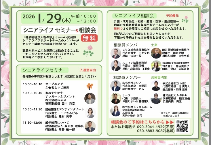 「無料セミナー」「シニアライフ相談会」の案内を掲示。