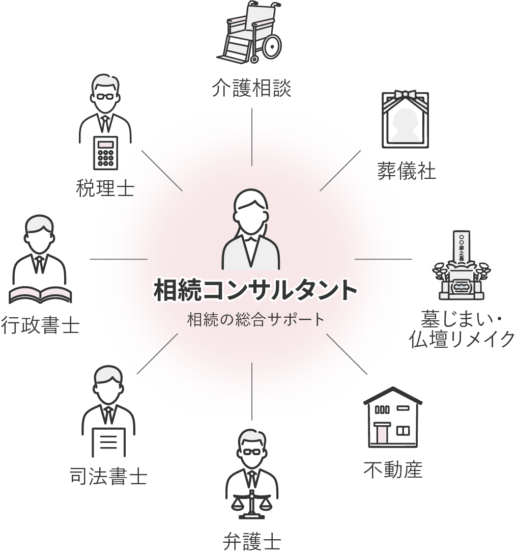 相続コンサルタントとは、弁護士・司法書士・行政書士・税理士などの専門家と連携しながら、相続に必要な各分野を整理し、相続全体を整えていく役割を担います。